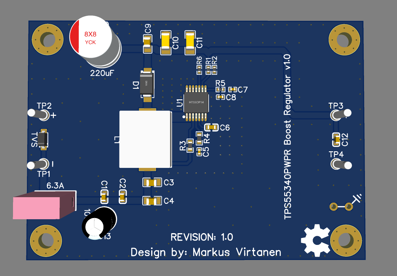 This project implements a DC-DC boost converter that raises the voltage of a single-cell Li-ion battery to a regulated 5 V output. The design is based on the TPS55340 boost regulator, which is well suited for stepping up low input voltages to a higher, stable output with good efficiency.