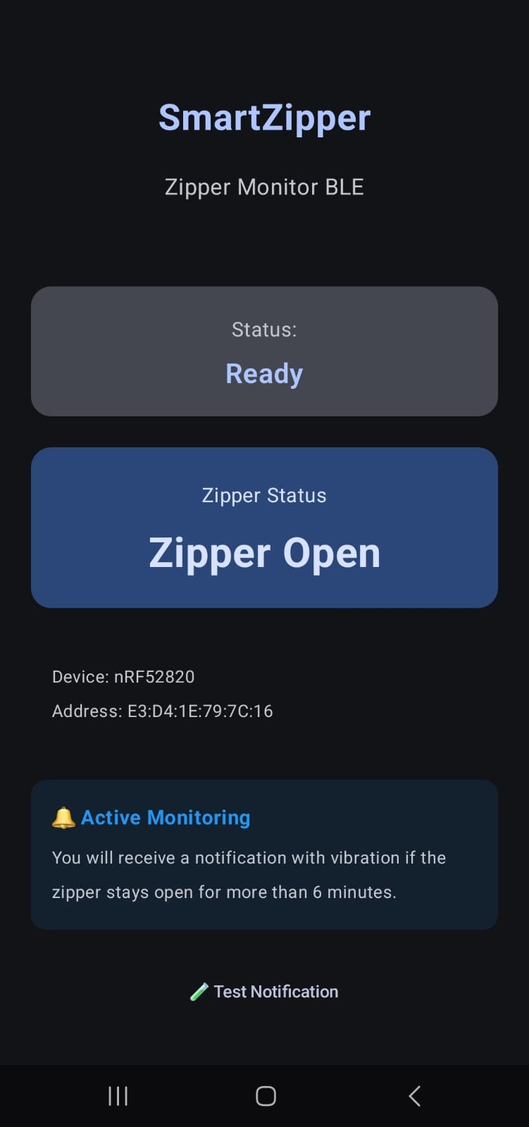 Smart Zipper is a small wearable IoT device that detects the state of a clothing zipper (secured vs unzipped). A tiny magnet on the zipper slider is sensed by a Hall sensor inside the wearable. An nRF52820 sends the zipper state to an Android phone via Bluetooth Low Energy and the app can notify you discreetly if the zipper remains unzipped for too long.