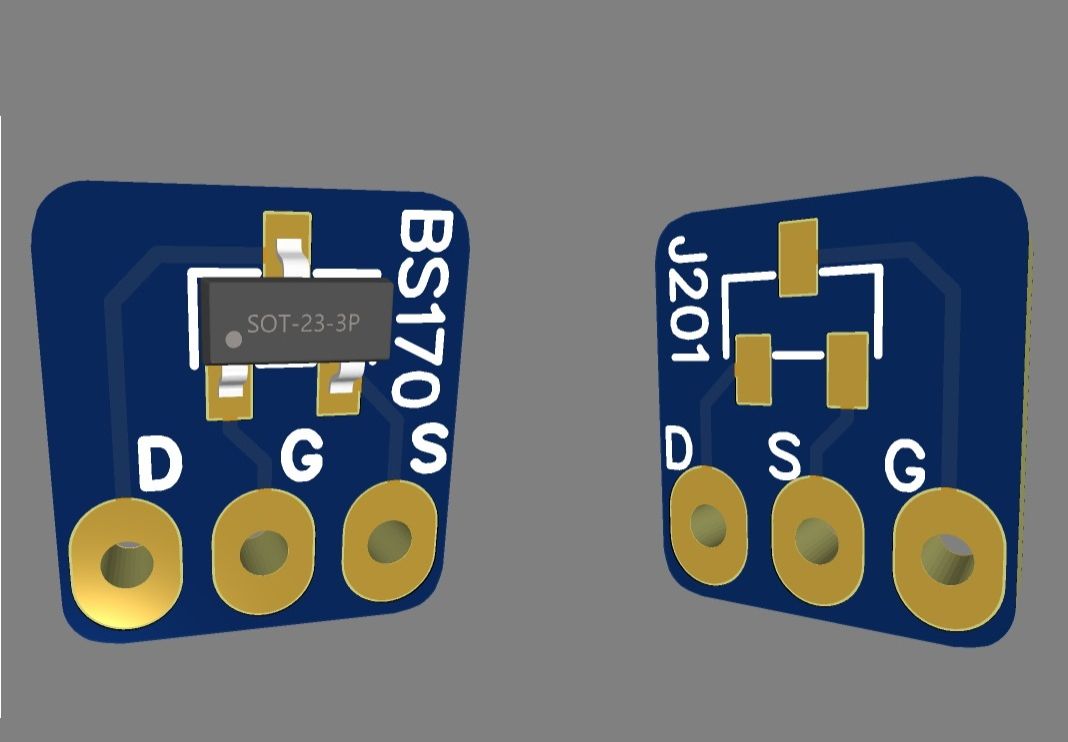 Adapter to use (SOT-23-3) FET transistors with 3-pin ribbon as (TO-92). These adapter boards allow you to use surface-mount FETs in through-hole applications. The adapter PCB is double-sided, one side J201 (D-S-G), the other BS170 (D-G-S). The pcbs are also very small, they won´t be higher than using conventional TO92 transistors.